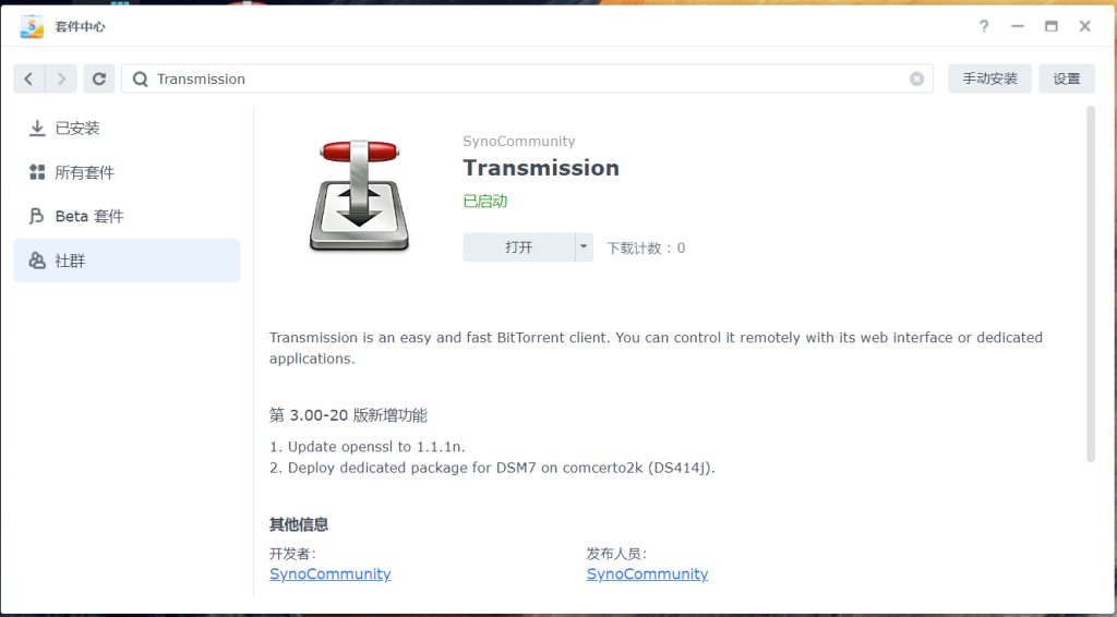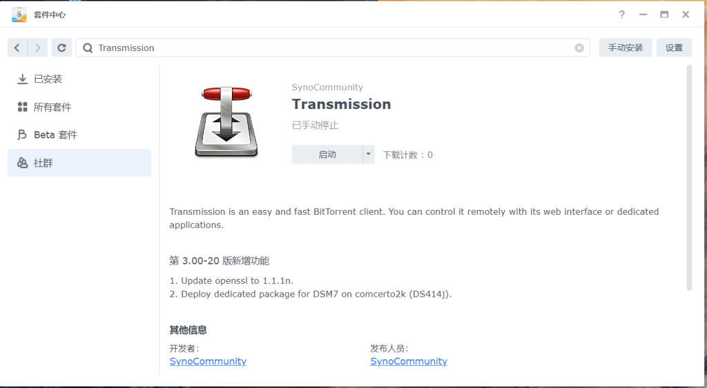 2.在"社群"页面找到Transmission,安装(因为是国外第三方软件源,国内访问可能会有问题,请自行查找办法,本篇暂不推荐)