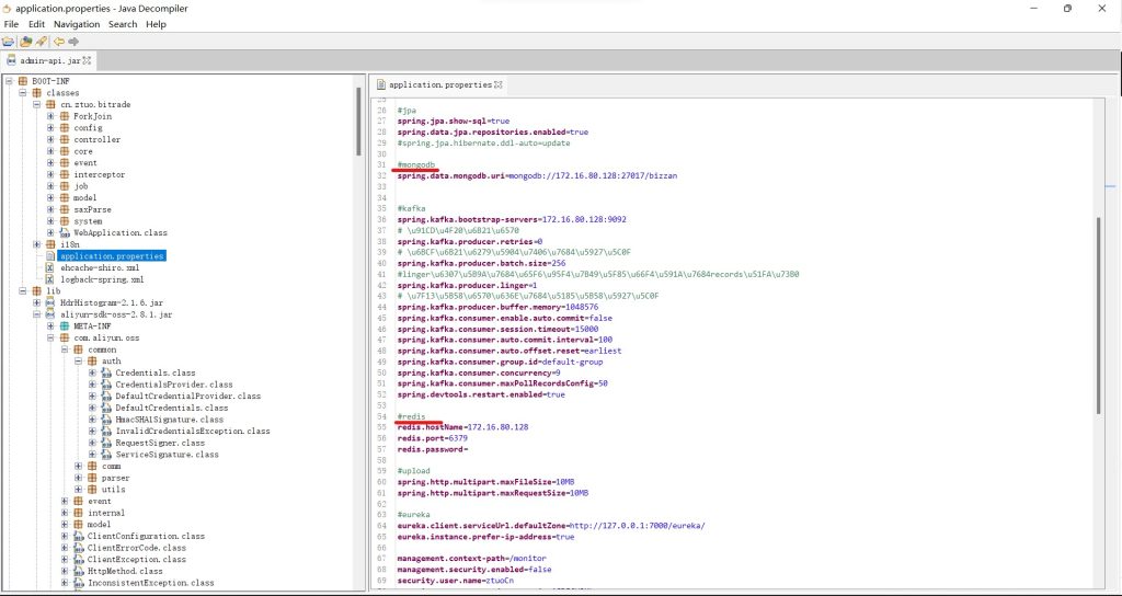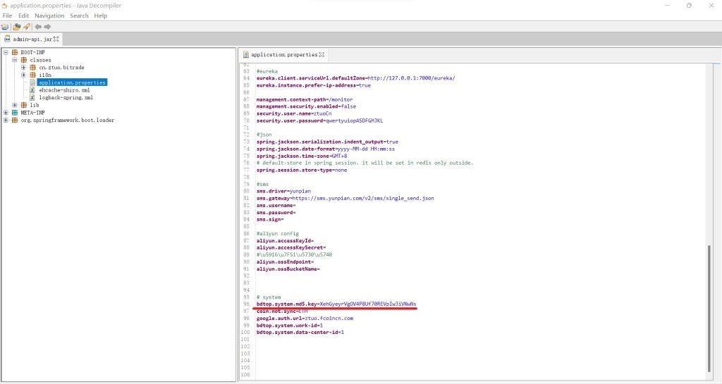 (方法2)反编译admin-api.jar包,查看application.properties配置信息中有md5的key,再关联其他配置确定是md5加密,同时问题10的答案也能出来了