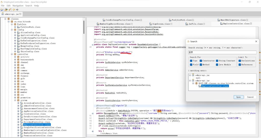 ,我们可以去反编译那几个包搜一下关键词,最后在admin-api.jar里查看到了相关信息,确定是md5加密.