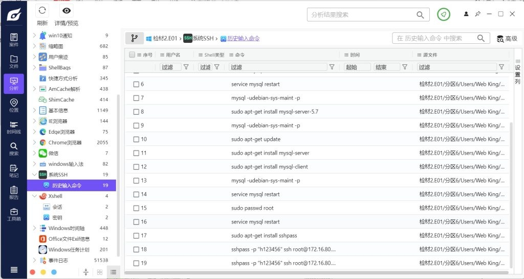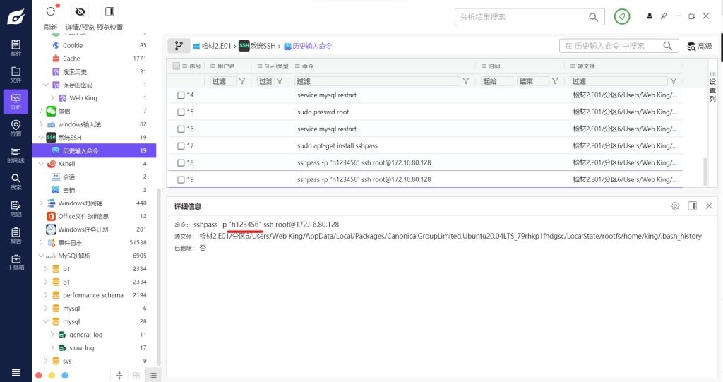 PS:这里需要注意,火眼里的系统ssh历史命令其实是误导项(差点踩坑),因为仔细看其实都是linux命令(因为检材2里面还有wsl)