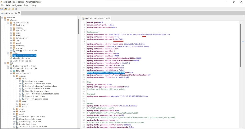 (方法一)其实根据检材1的admin-api.jar中的BOOT-INF.classes.application.properties配置文件,可以找到问题21/22/24三问的答案,位置如下图