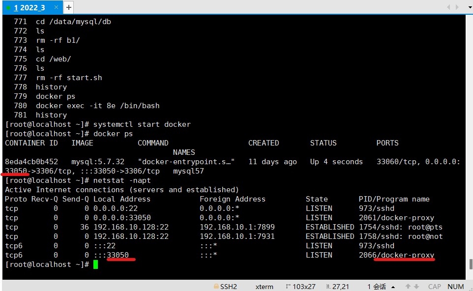 查看历史命令,发现大量docker命令,于是启动docker看看,发现就是docker占用的33050端口