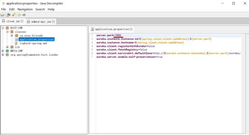 (方法2)也可使用jd-gui(Github地址)将这几个包反编译查看声明信息,发现cloud.jar配置中有7000端口